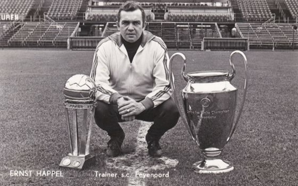 essere in grado di miscelare senza appiattirsi su uno di essi. Le sue squadre erano in grado di applicare i principi di un calcio fluido e spettacolare ma allo stesso tempo scendevano in campo ogni partita con il coltello tra i denti riuscendo a calarsi in ogni tipo di situazione di gioco. Oltre a essere un grande teorico, Happel era infatti soprattutto uno stratega: preparava ogni partita abbinando ai suoi fondamenti una variante tattica appositamente studiata come contromisura ai piani avversari. Esattamente come l’ordinatore teorizzato da Machiavelli egli teneva conto di tutte le circostanze presentate dal contesto, applicando un calcio che metteva in campo cinismo e raffinatezza; un calcio privo di fronzoli fatto di pressing alto e verticalizzazioni immediate, simili per certi versi alle folate di contropiede all’italiana con la differenza che il recupero-palla avveniva almeno trenta metri più avanti. Questa fusione di stili rese le sue squadre indecifrabili per la maggior parte dei suoi avversari e costituì una lunga carriera di successi, raggiunti quasi sempre con lo sfavore del pronostico: 2 coppe dei campioni, 8 campionati nazionali nazionali in 4 paesi diversi su tutti.